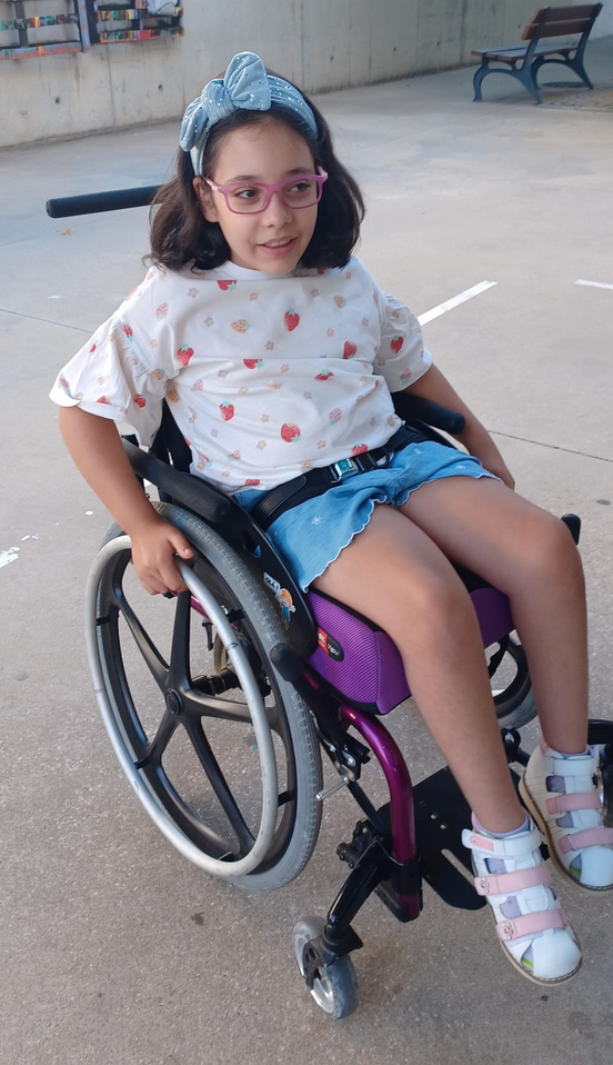 A Margarida foi diagnosticada à nascença com Leucomalácia Periventricular, uma condição que afetou profundamente a sua parte motora, levando-a a depender de uma cadeira de rodas para se deslocar.